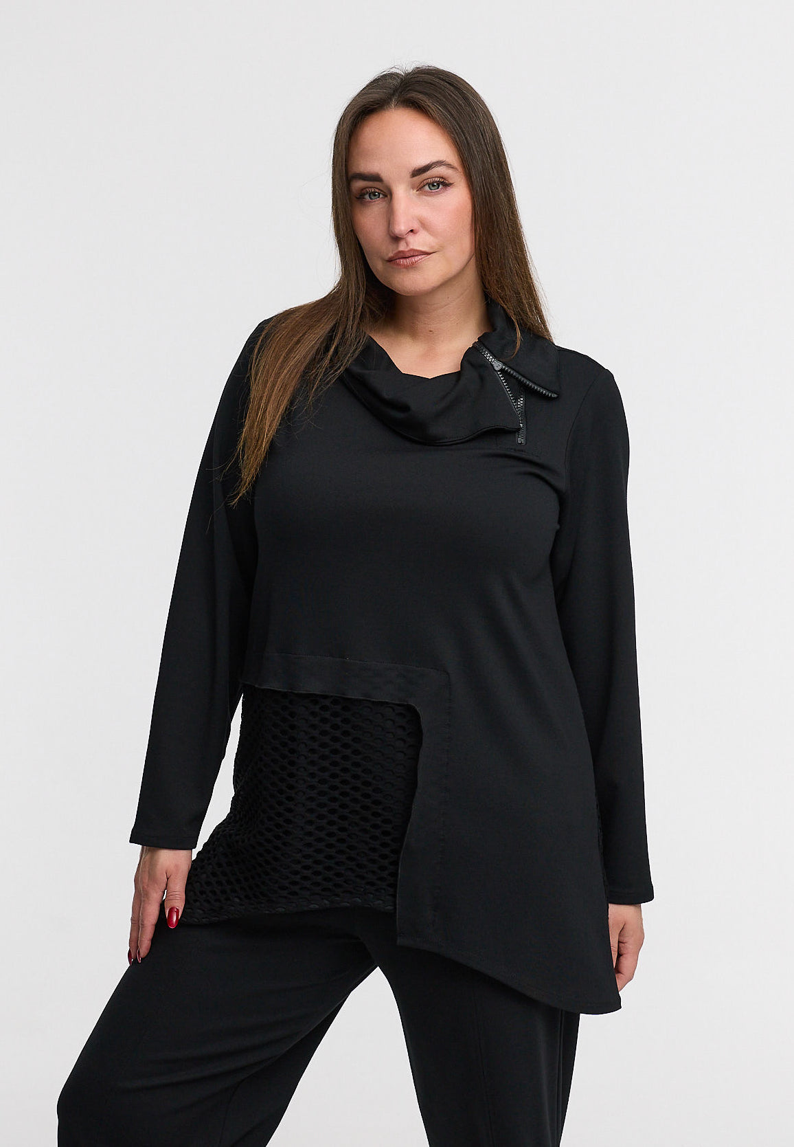 Die Tunika „Lunet“ kombiniert Minimalismus mit Raffinesse. Der strukturierte Einsatz auf Vorder- und Rückseite sorgt für Tiefe und Bewegung, während der locker fallende Schalkragen mit Reißverschluss einen modernen Akzent setzt. Der asymmetrische Schnitt betont den individuellen Charakter dieses Styles und verleiht jeder Bewegung Leichtigkeit.